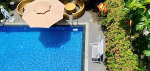 Hồ bơi rộng 150m2 nằm giữa khuôn viên xanh mát, xung quanh bố trí bàn ghế thư giãn, nổi bật với hòn non bộ và hàng hoa sử quân tử toả hương dịu nhẹ suốt cả ngày.