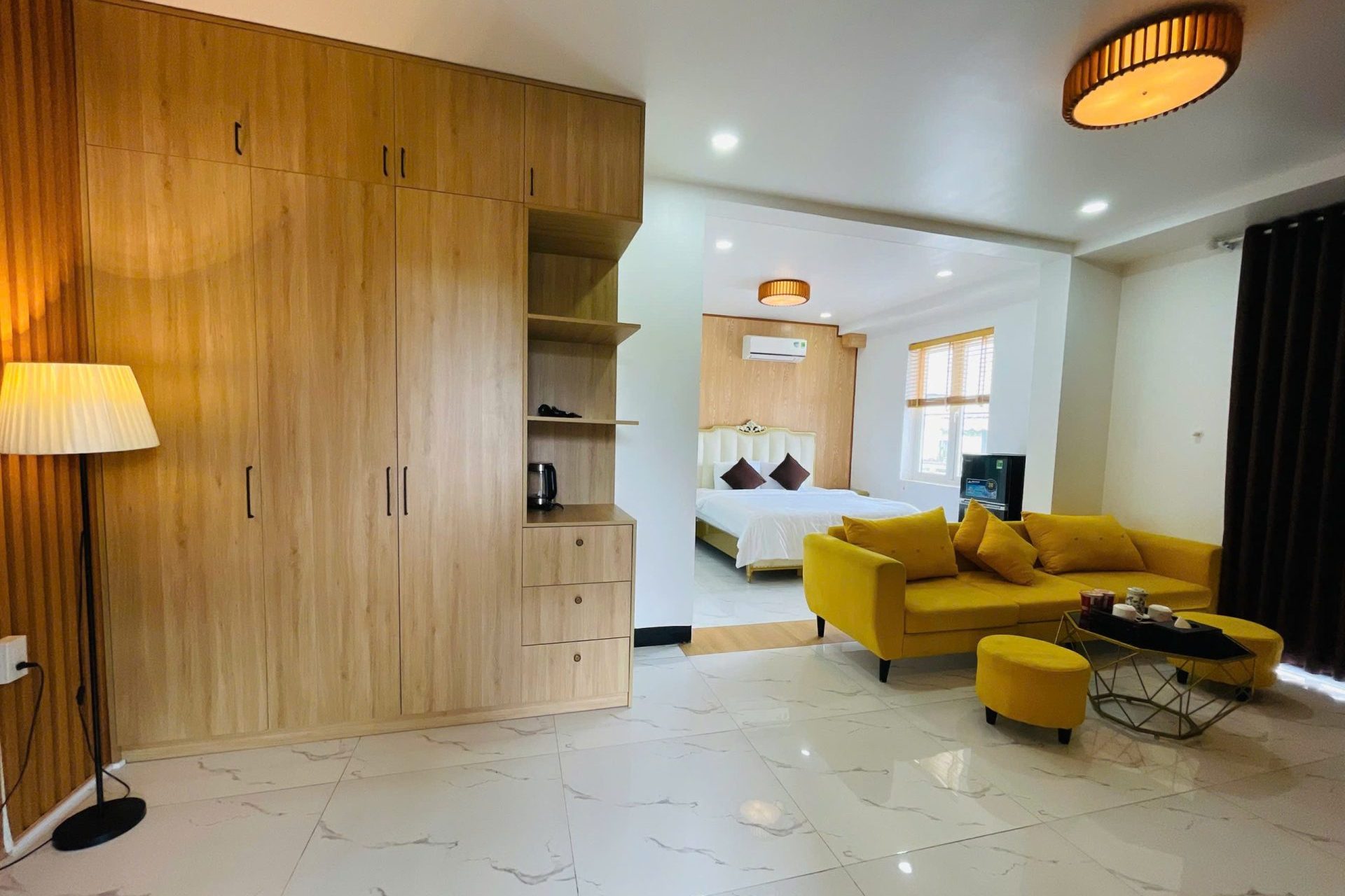 Êm Villa sở hữu phòng khách sang trọng, bếp đầy đủ tiện nghi và thang máy hiện đại kết nối các tầng - mang đến trải nghiệm nghỉ dưỡng đẳng cấp và tiện lợi.